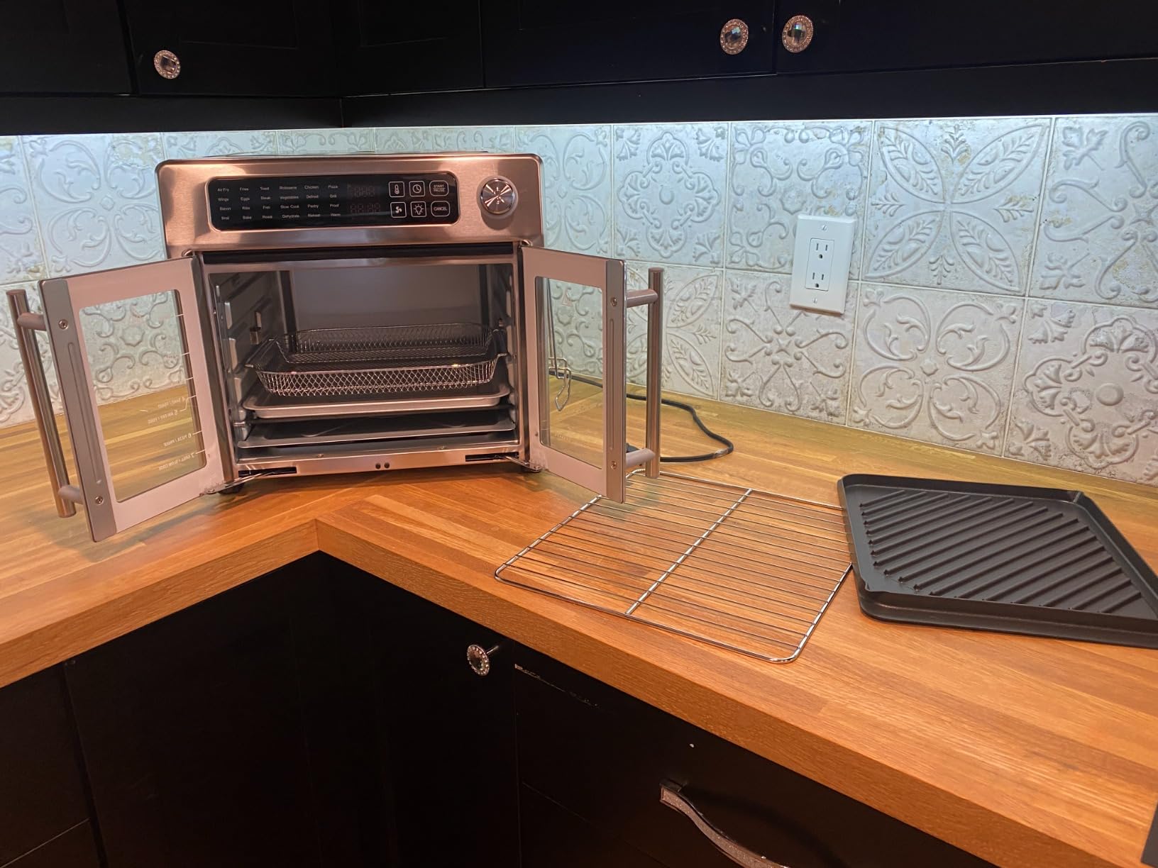- 7 ACCESSORIES INCLUDED: includes grill plate, rotisserie spit, rack, fetch tool, bake pan, drip tray, and crisper basket